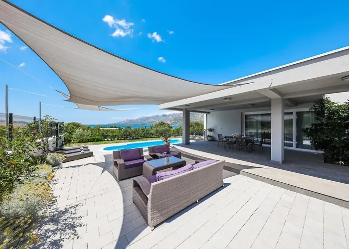 季節限定の屋外プ-ルを提供するVilla Immortelle With Pool And Sea Viewのある所はロバニスカです. 器具でいっぱいの台所と3室の寝室があります. 顧客はテラスでリラックスできます.